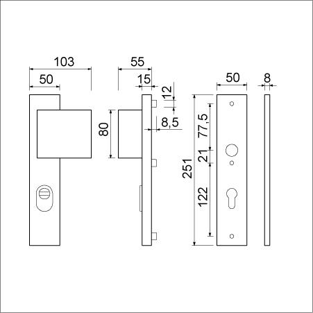 vierkantstift 8 mm en 3 schroeven M6 RVS.