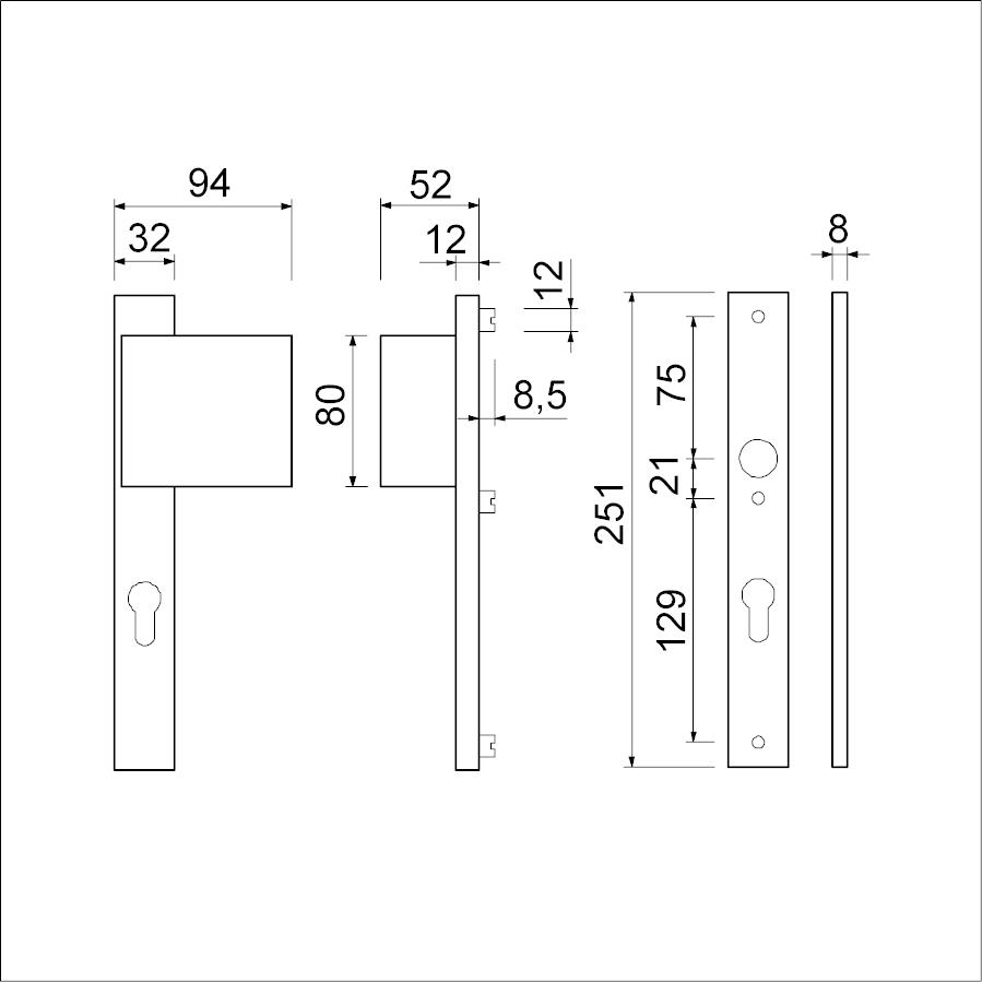 vierkantstift 8 mm en 3 schroeven M6 RVS.