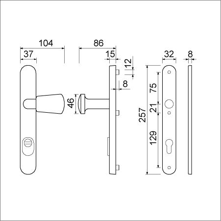 binnenschild 8 mm dik en 32 mm breed met deurkruk 378 ROTA verend vastdraaibaar,