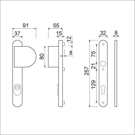 binnenschild 8 mm dik en 32 mm breed met deurkruk 378 ROTA verend vastdraaibaar,